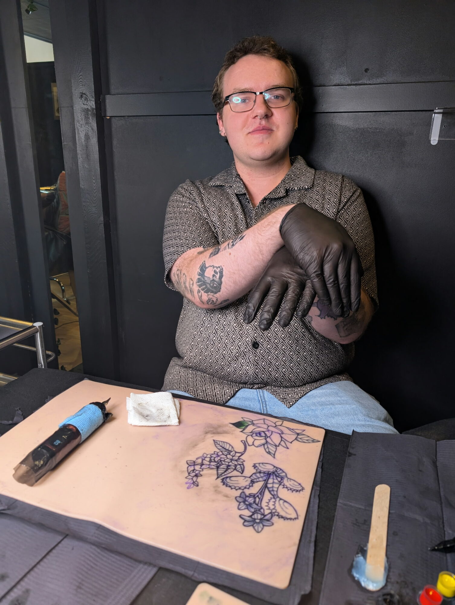 Growing up I was always an artist. From creating characters or creatures to drawing existing ones from my favorite cartoons. Drawing was always something I enjoyed doing and has been the most consistent hobby in my life so far. Through the pandemic and graduating high school it became very apparent to me that I wanted to pursue a career in art and follow my passion. The people I grew up around were covered in tattoos and I’ve always had a fascination with them. I got matching tattoos with my best friend for my first tattoo and was immediately hooked. In my first year of getting tattoos I got 15 in a single year often getting multiple tattoos at a time, and after being in the shops for so long I began imagining what my life could be like if I pursued it as a career.