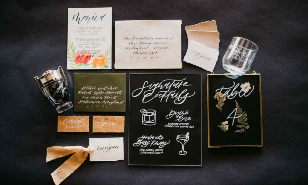 I also provide calligraphy and art services for weddings through day of signage and stationery. I specialize in using calligraphy as a way to tell a story. The details at a wedding are the best way to share your love story with your guests. Did you connect through a mutual love of craft beer? Let’s use vintage bottles or beer growlers as table numbers or a seating chart. Do your guests come from all over the country and world because you love traveling? Let’s have a map with the names of your guests and where they come from at the reception. I love learning about the couples I work with and how we can use calligraphy to create connection on their big day.