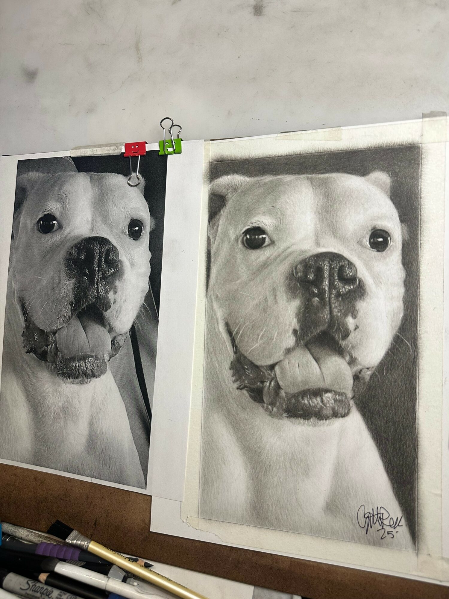 I also do charcoal drawings of the dogs I watch randomly and give them out to the pet parents or do commission drawings.