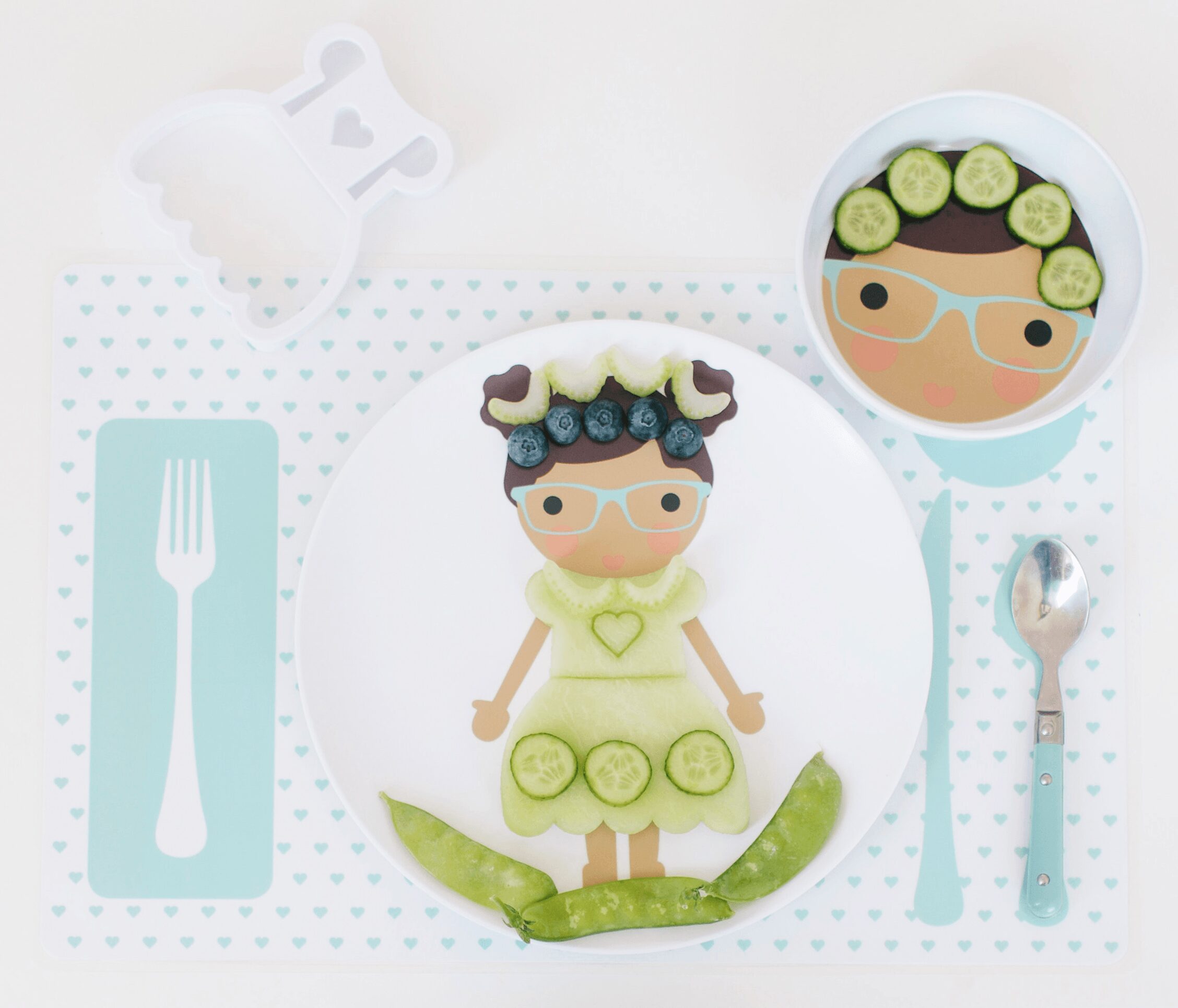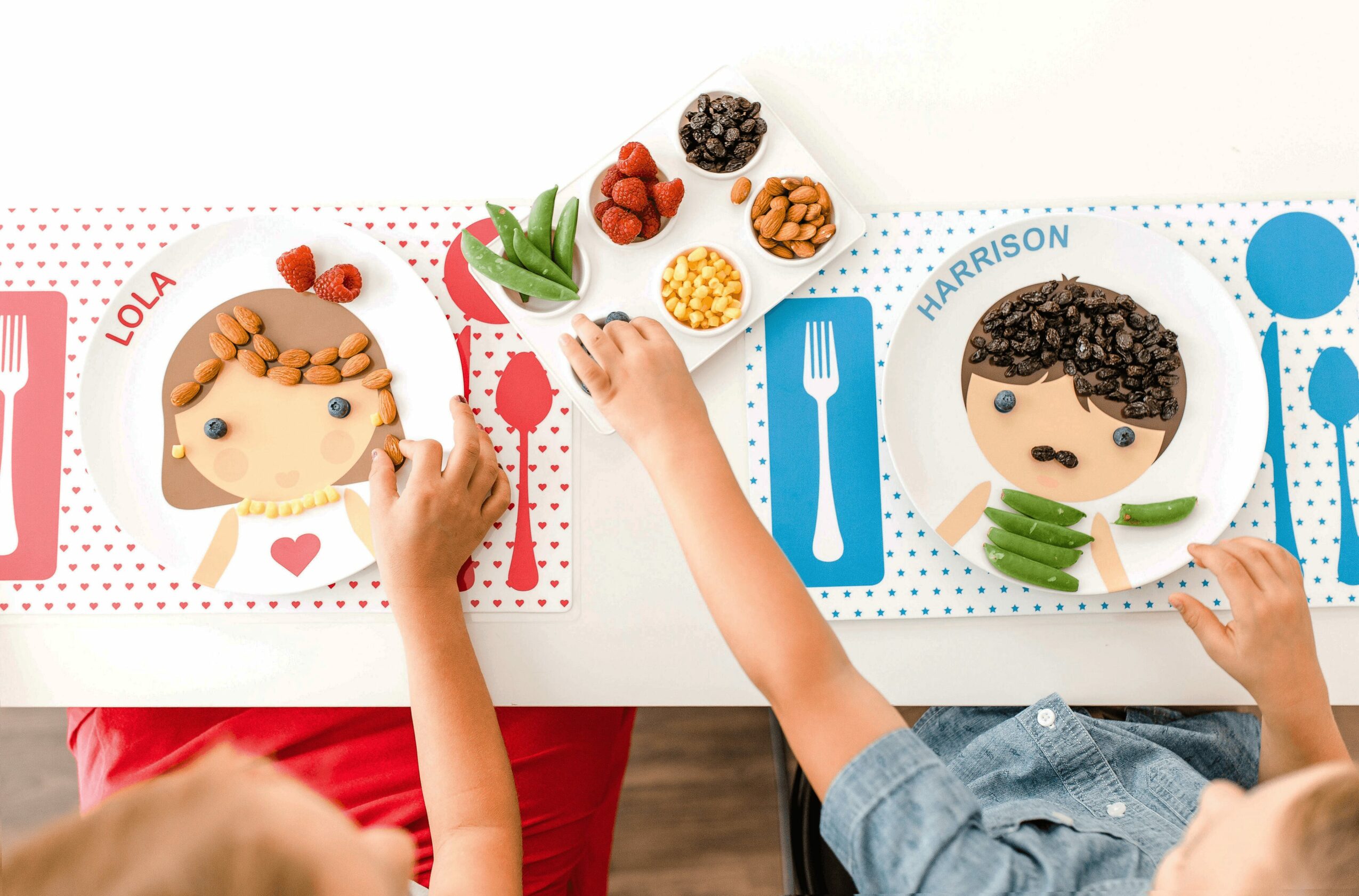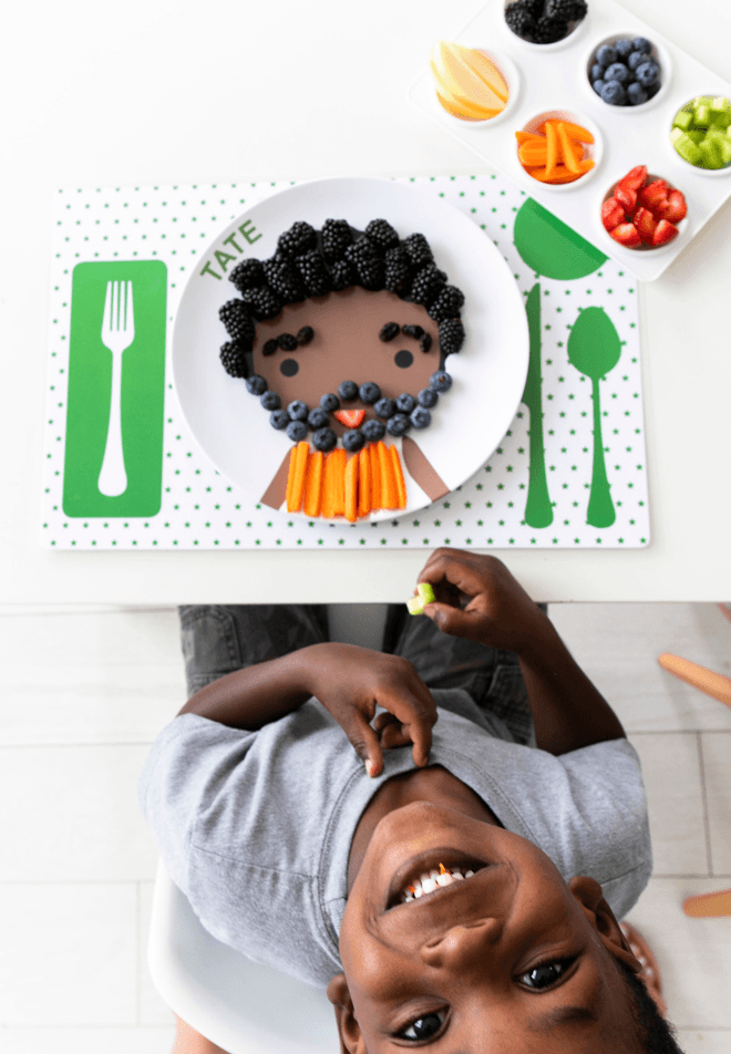 The plates encourage and help picky eaters. Parents can lay out a variety of colorful foods, including their child’s favorites and those that they may be reluctant to try. Then encourage them to create a “blueberry headband” or “strawberry cheeks” and explore food in a fun way without the pressure of eating it.