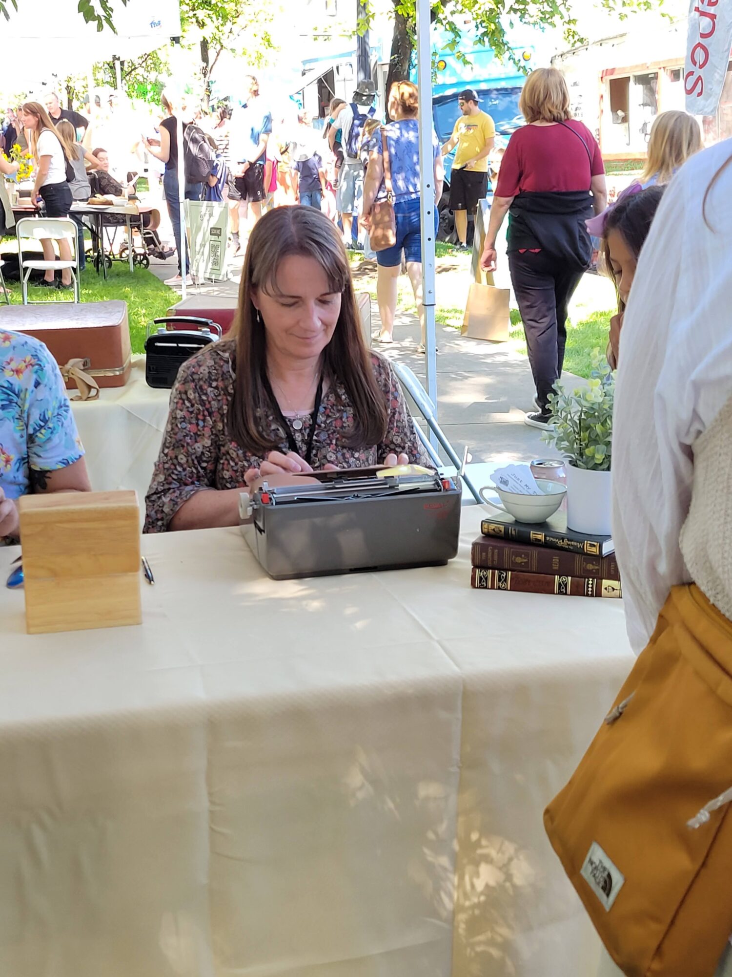 We generally work very well together, so most of our struggles have had to do with our typewriters. While we love all typewriters, we can only really use manual ones with cases for our gigs. We’ve also had to learn how to repair these machines on the fly, so that we are not impeded from creating poetry by a jammed key. There was also a learning curve to understand what equipment was needed for different gigs. We now bring back up typewriters and battery operated lamps. Truthfully, however, it has mostly been smooth sailing. You might now expect that from a team like ours (mother and daughter-in-law), but we are grateful that we work well together as people as well as family and business partners.