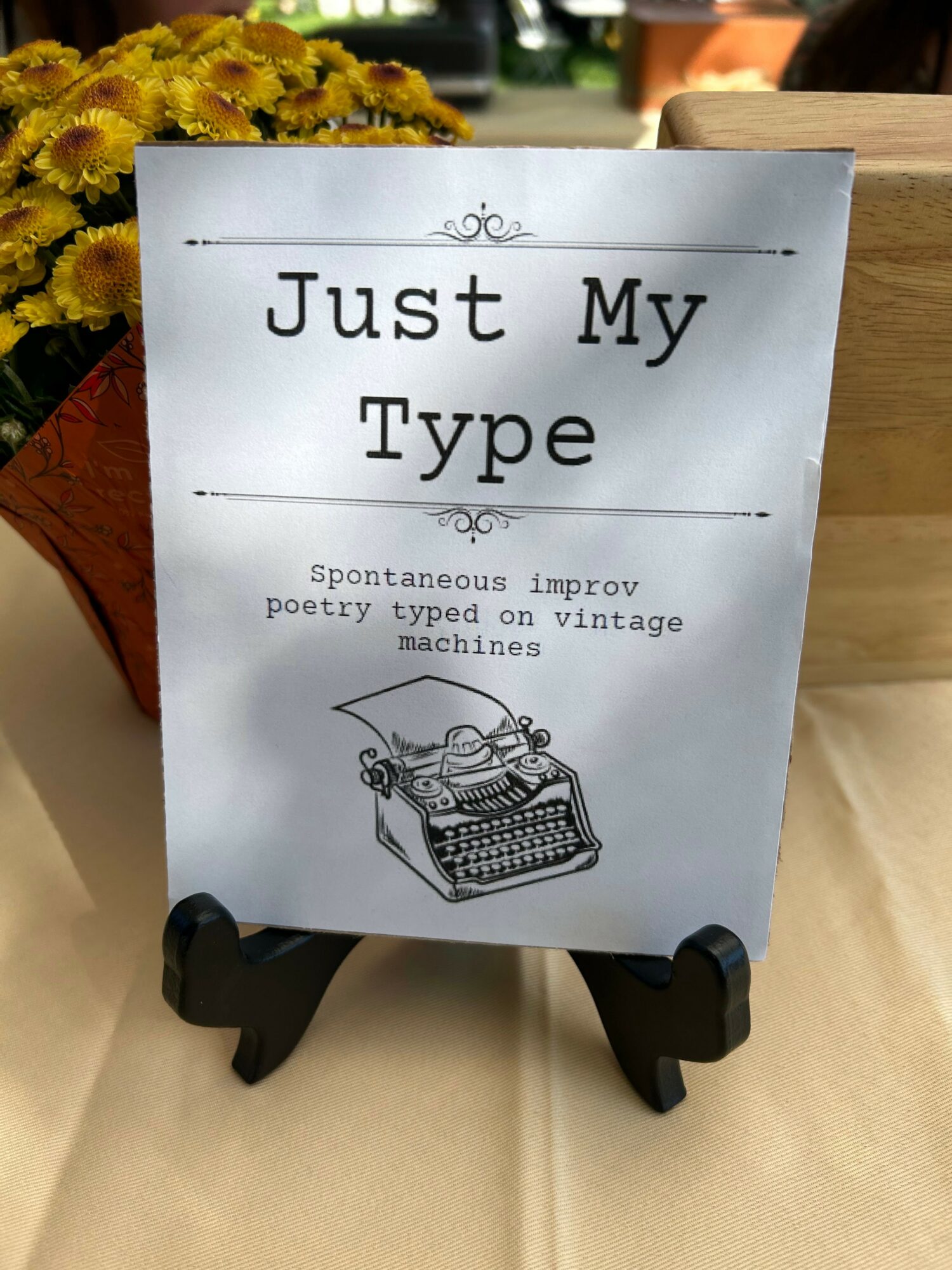 We are a mother and daughter-in-law team that started typing poems at a local Halloween event. While we started on a whim, we quickly fell in love with the process and decided to create a business around this idea. Now we are “poets for hire”. We travel with our typewriters and write improv poetry based on the prompts we are given by our customers. We are wrapping up our third year, and love it just as much now as we did on our first day.