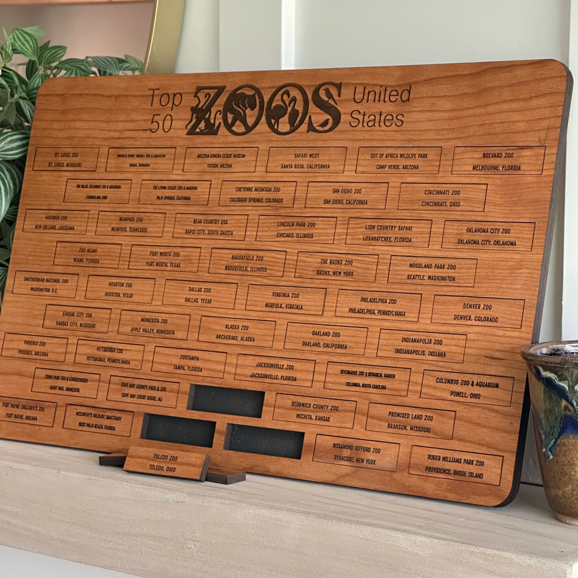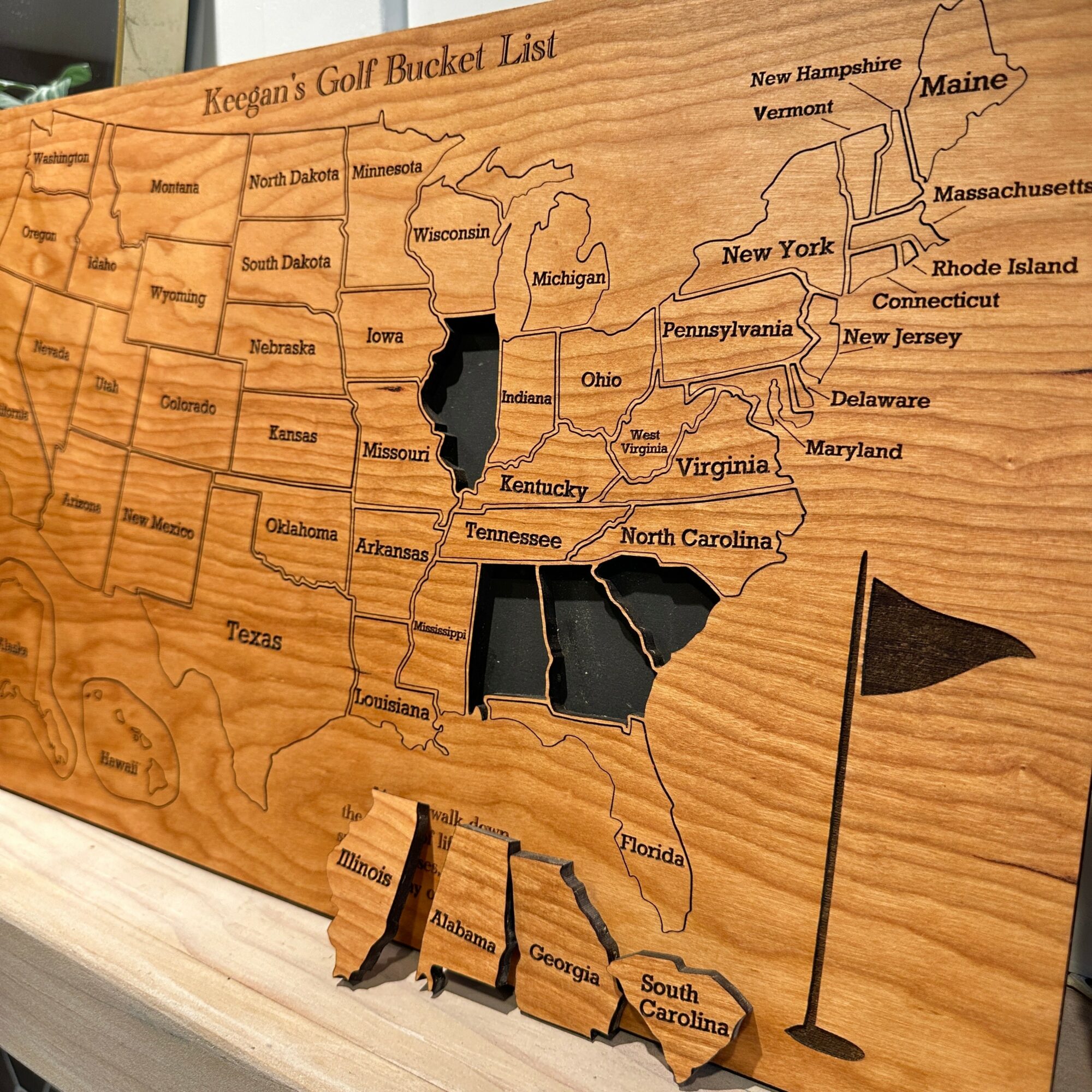 I was a teacher and did not love the administrative side of the work I was doing so my husband wanted to help. We found out about CNC lasers and it looked like a fun way to start a little side hustle so we dove in headfirst and never looked back! We experimented with a lot of different products until we landed on bucket list boards, wooden wall art that tracks your bucket list. We’ve made boards for visiting all the national parks, losing 100 lbs, and everything in between. We currently have about 125 products in our shop and it has been so fun helping people with their goals and bucket lists