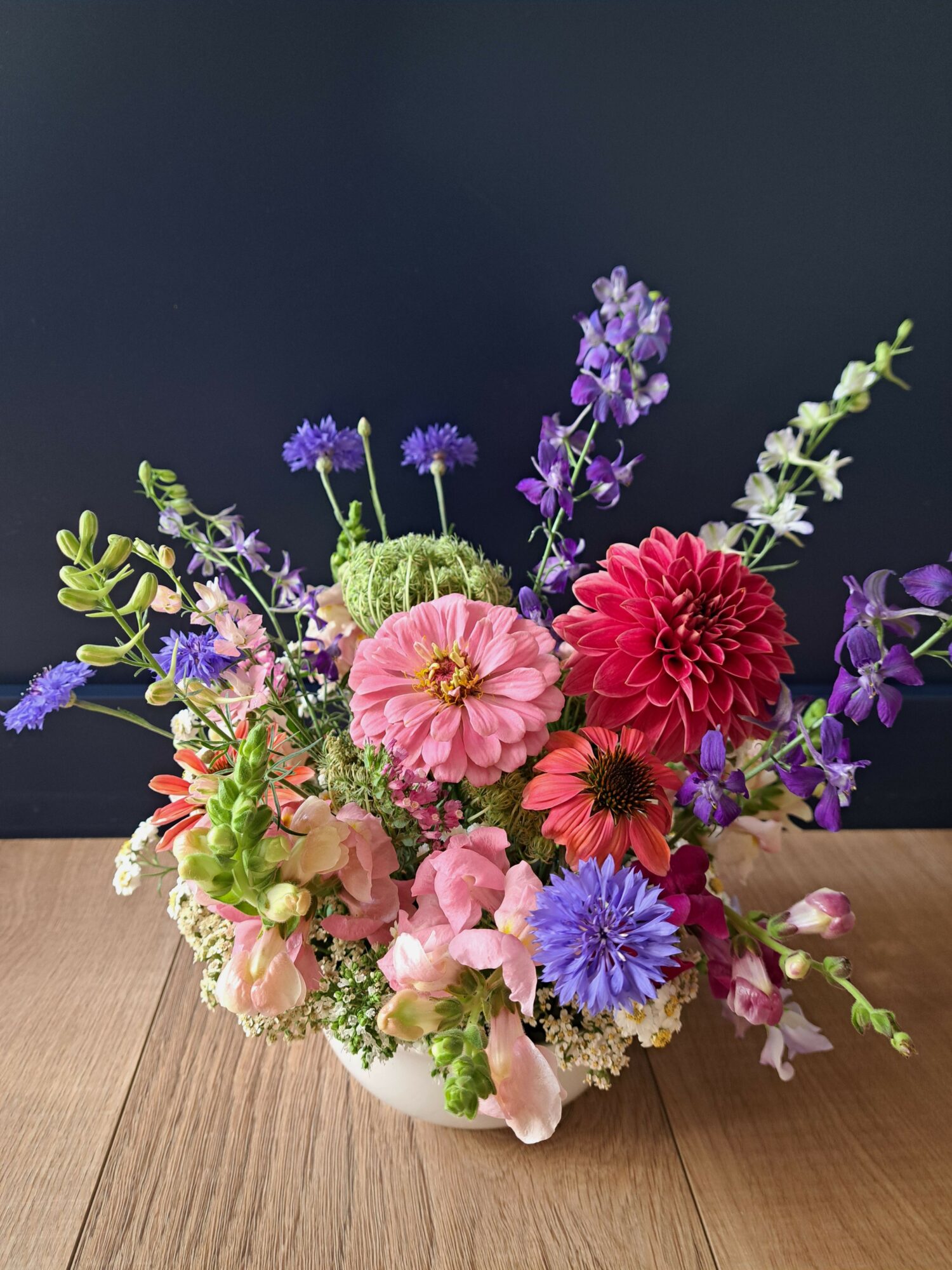 One of my goals from the start was to become better at arranging and displaying flowers. My backyard garden has become my own flower warehouse of sorts to pick from when I want to make something for my home or when I get a custom order. I’ve studied color, form, design, structure in all sorts of methods from traditional to contemporary. I love how flowers can be put together in a way that makes a person feel happiness, joy, sympathy, reflection, or love. There’s nothing like handing a customer a bouquet and seeing the smile on their face.