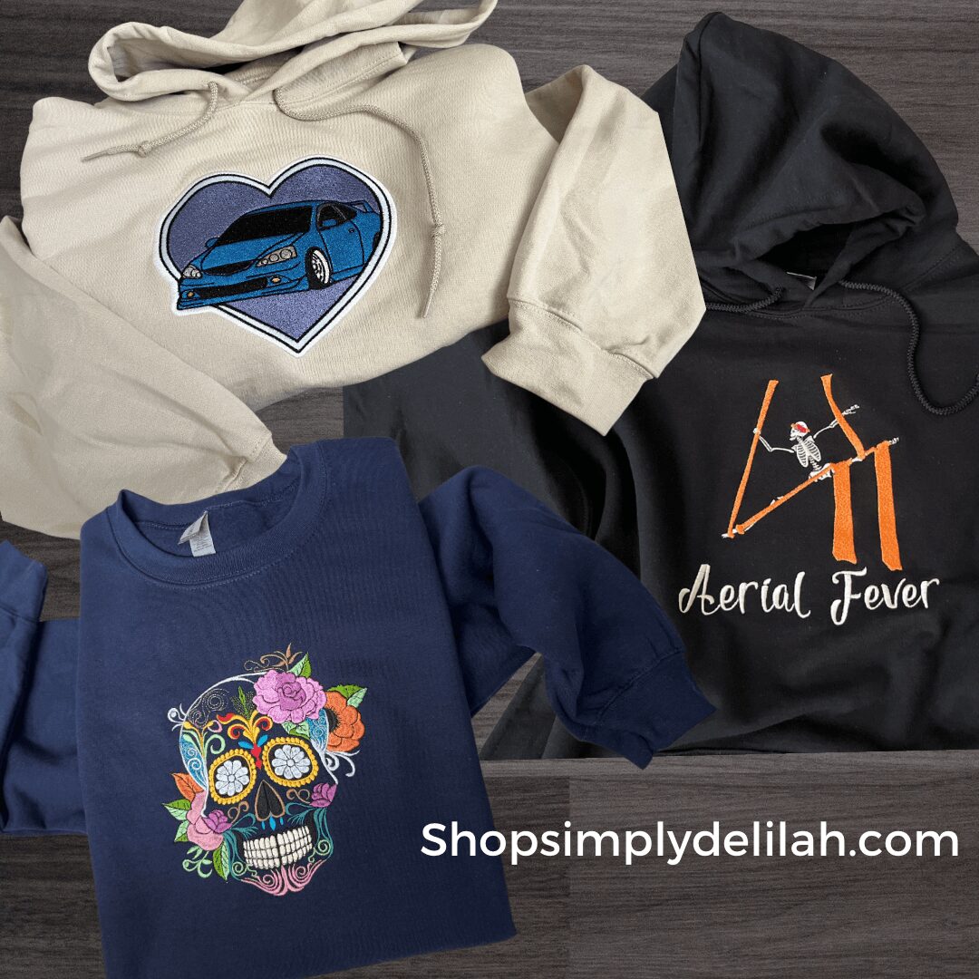 With machine embroidery comes a high cost and a learning curve. You have to invest in thread, stabilizers, hoops and material to stitch on. There have been times when I stitched a design on backwards, upside down, or the back of the sweatshirt caught in the machine, I have ruined countless sweatshirts but the love I have when a project comes out perfect is what keeps me going.