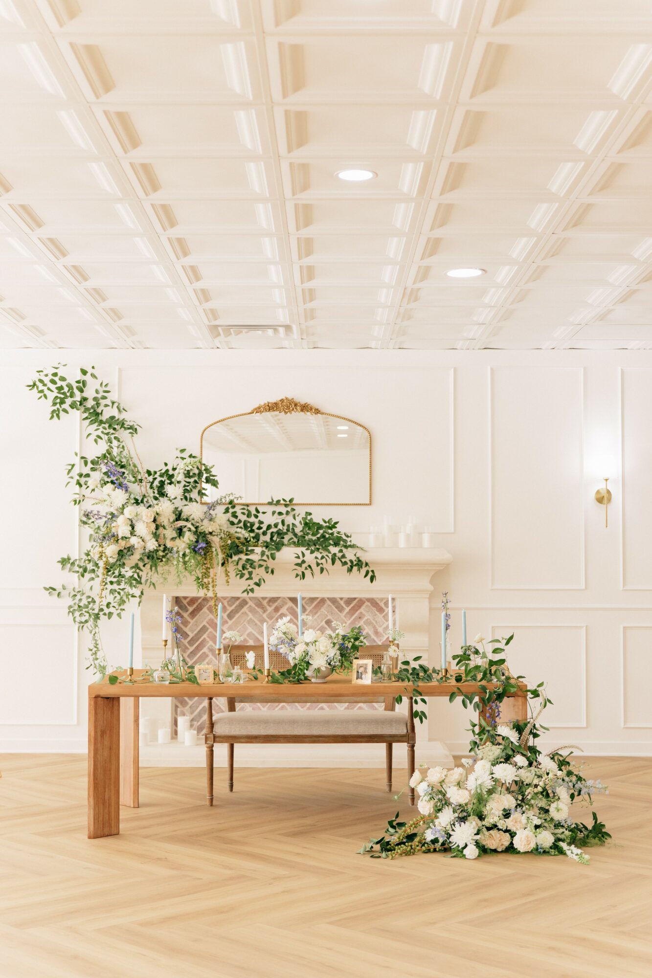 You won’t find concrete, metal, brick, or other industrial-area aesthetics at La Fête. Our ballroom walls are off-white, appointed with elegant molding work, all enhanced by a warm herringbone floor. We wanted our brides to see multiple signature moments (double french door entryway, arched bookcases etc.) as they entered, which would inspire them as they evaluated where to celebrate their special day.