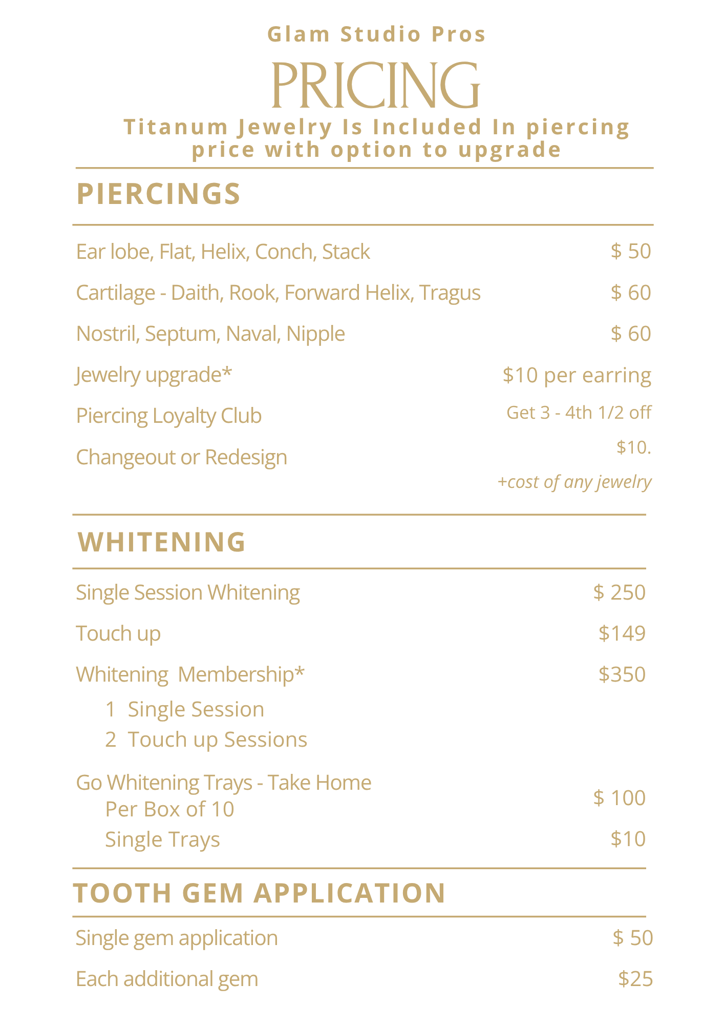 Our studio was built on the belief that beauty services should never sacrifice safety or professionalism. We noticed that many teeth whitening and piercing services focused purely on aesthetics — often without certification, regulation, or sterile practices. We wanted to change that. Our mission has always been to bring medical-grade standards into a creative, welcoming space where clients can feel confident that every procedure is performed with precision, care, and certified expertise.