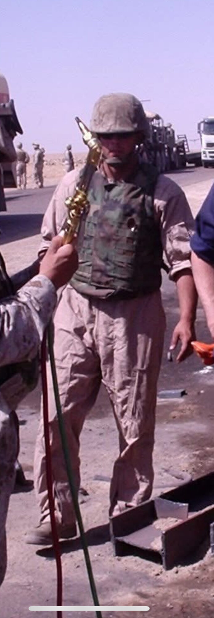 January 2004 I shipped out on the advancement unit, we flew from March Airforce base in Ca. to Indonesia, where we boarded MPR Lopez, a Maritime Prepositioning Force ship that we took to Kuwait, this ship was loaded with 7 levels of vehicles, tanks and warfighting vehicles. While on the ship we had to go through all of them for inventory and maintenance, to make sure they were ready when we got to Kuwait. When we got to Kuwait, we unloaded the ship, my unit then flew on a C130 to Al Asad Airbase in Iraq, about 100 miles west of Bagdad. We then built up the living quarters for the support unit and our unit. I was part of the recovery and maintenance detail, our job was to recover vehicles in the Anbar providence that had been disabled due to various reasons, IED’s, Land mines ECT. During this deployment my daughter Nataly was born (March 31st 2004) Originally I was not supposed to deploy on this detail, however I had learned that one of my fellow marines was having a hard time with the thought of deploying, plus we were going to utilize a new 7-ton vehicle that I was trained on, he wasn’t. I talked to my command about it and convinced them that they would be better off having somebody who wanted to be there and new the equipment better, instead of sending somebody who didn’t want to be there. They agreed and I was supposed to be able to fly home in March for the birth of my daughter, however, in the spring of 2004 it became too dangerous to get me out of where we were, so I missed her birth. May 9th, I was on a security detail for a convoy going to a base near the Syrian border, we got there at night with no issues, slept on the hood of our vehicles for the night which was our normal, at night it got cold there and the engines provided heat so it was easier to sleep. The next day May 10th was Mothers day, we were treated with a satellite phone to use to call our moms, we each got less than 5 minutes, just to say hi and wish our mothers happy mothers day. On our way back to Al Asad, our vehicle was hit by an IED or a roadside bomb. You know when they say in the movies that everything slows down in situations like that, its true. I still remember the ringing in my ears and being able to see individual specs of dirt moving very slowly across my face. When we gathered ourselves and came to a stop, a couple snipers who had seen it happen drove towards us to make sure we were good. They let us know that they had been watching this area for possible IED traps and the people who placed the IED made a mistake. The IED’s blast went away from our vehicle instead of towards us, leaving a huge hole the wrong way. I have no doubt, had this mistake not been made, I wouldn’t be writing about this today. We continued back to base, 3 of my fellow Marines in my vehicle received Purple Hearts due to injuries.