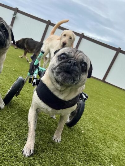 We are a training based facility where dogs can come in for daycare, boarding, or even in our home 5 day boarding & training program. Our favorite is watching the friends learn and grow in all sorts of ways. Friends who are nervous, anxious, socially awkward, or even antisocial can learn to play with friends and it’s so fun to watch that progress. We have also loved improving our facility to have splash pads, wading pools, k9 turf, large suites for the kids and just a total loving fun learning environment for kids to become their best selves.