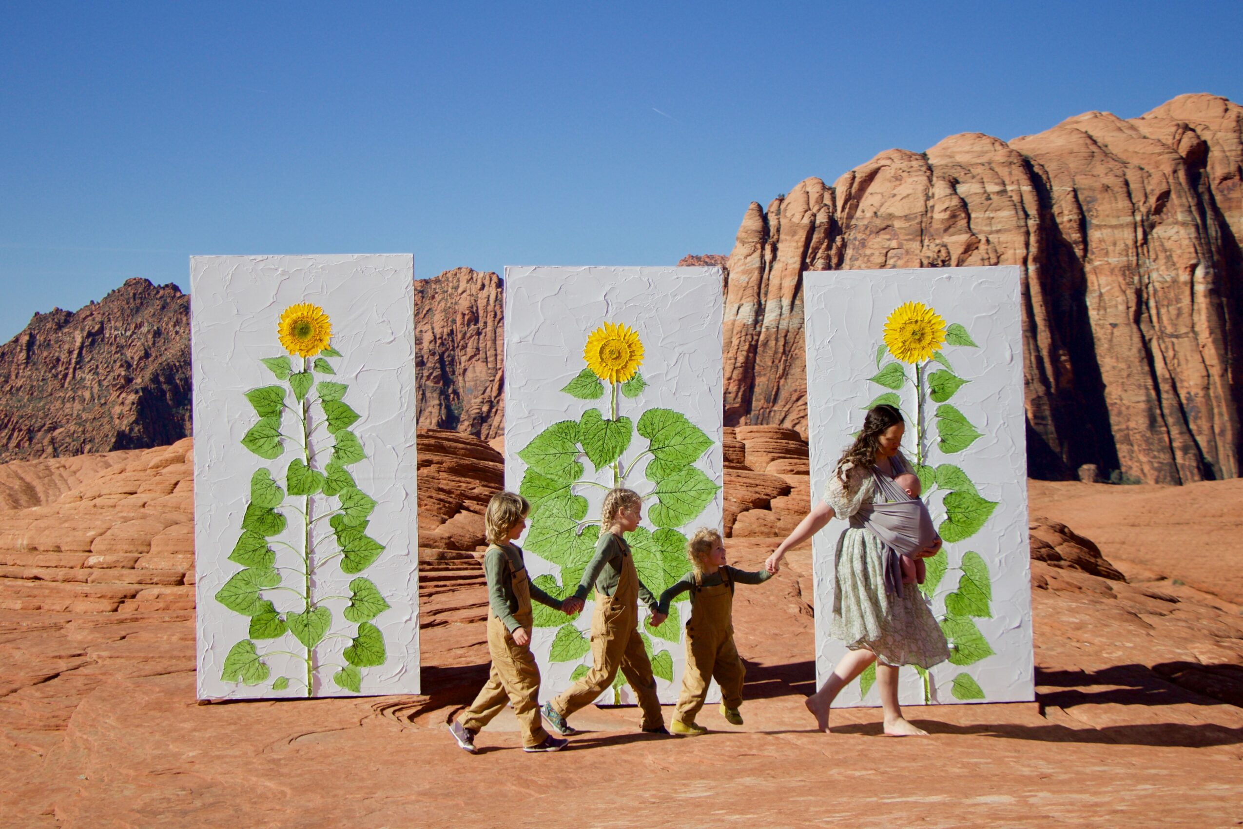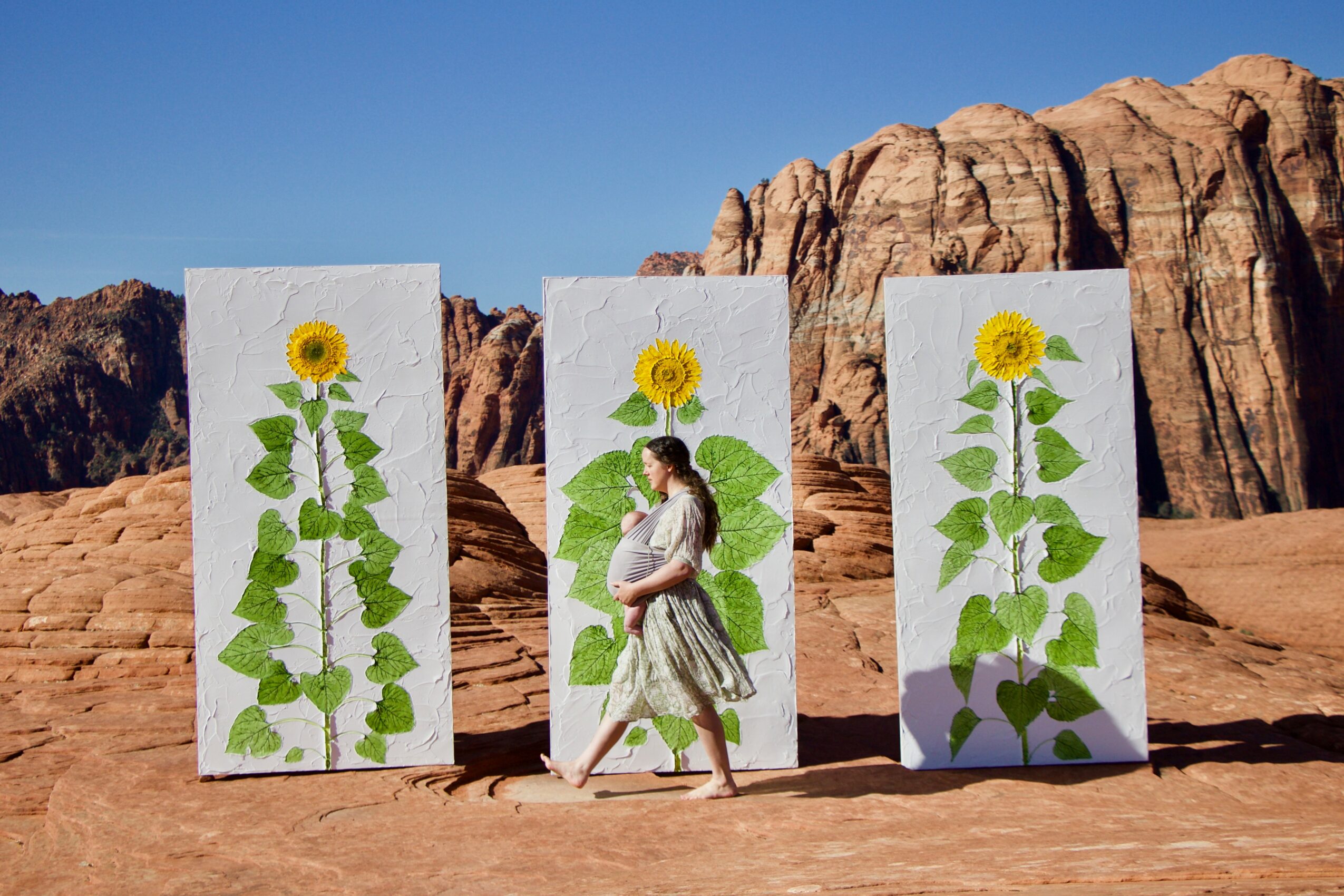 I’m especially proud of my monumental sunflower installations, including those created for the Bonneville Salt Flats and Snow Canyon in southern Utah. These works explore themes of resilience, nature, and connection to place. I am also deeply proud of my ongoing body of work celebrating motherhood, womanhood, and Mother Nature—concepts that intersect and evolve within my practice.