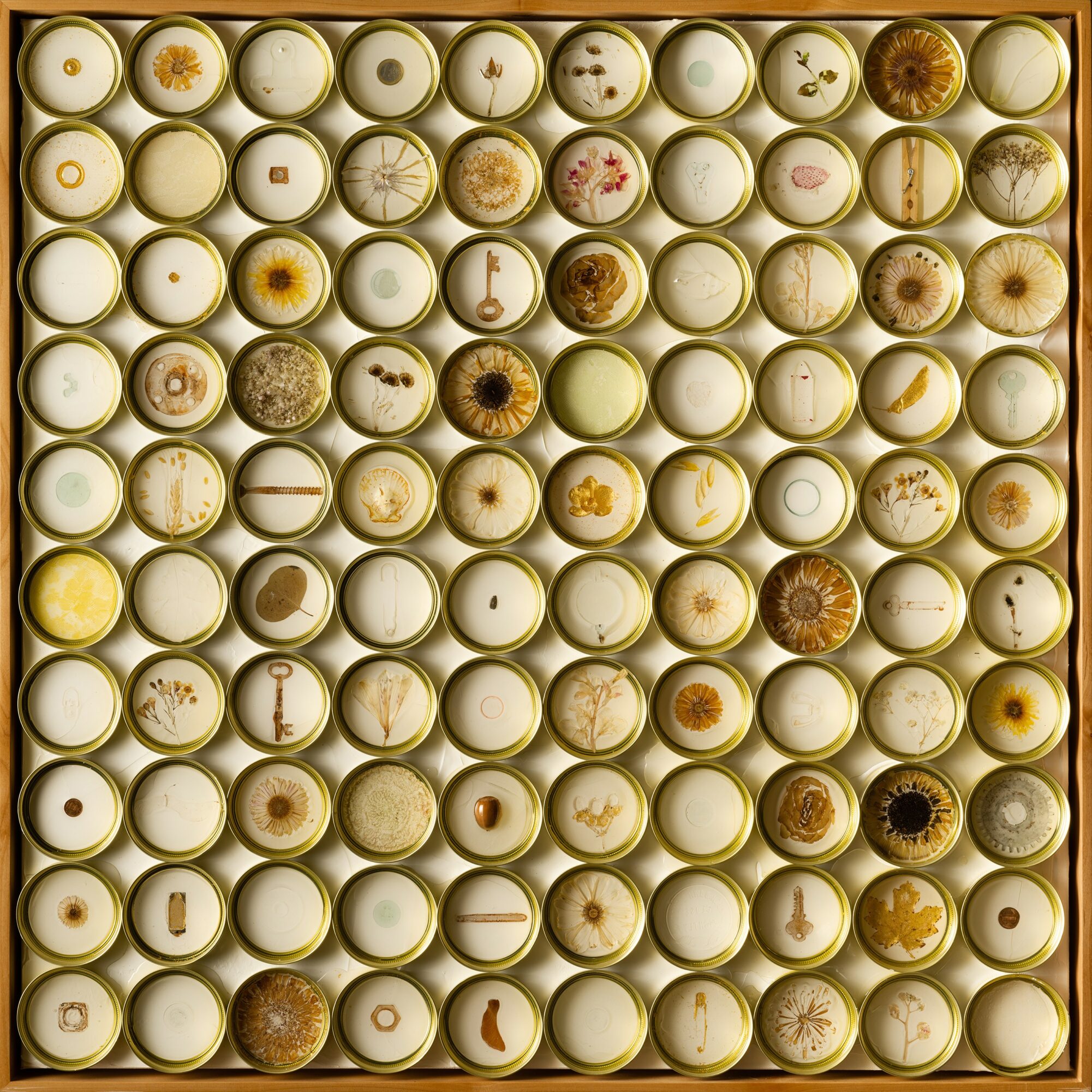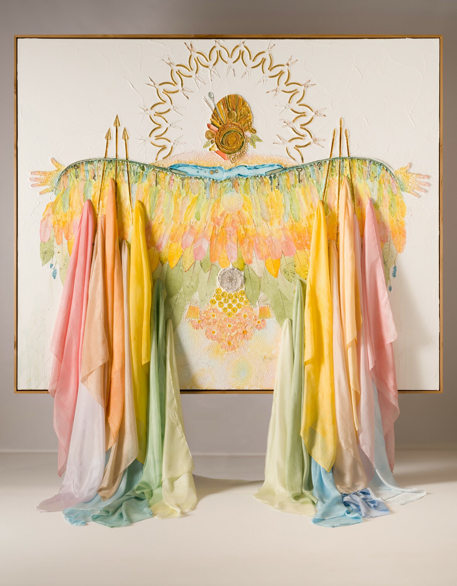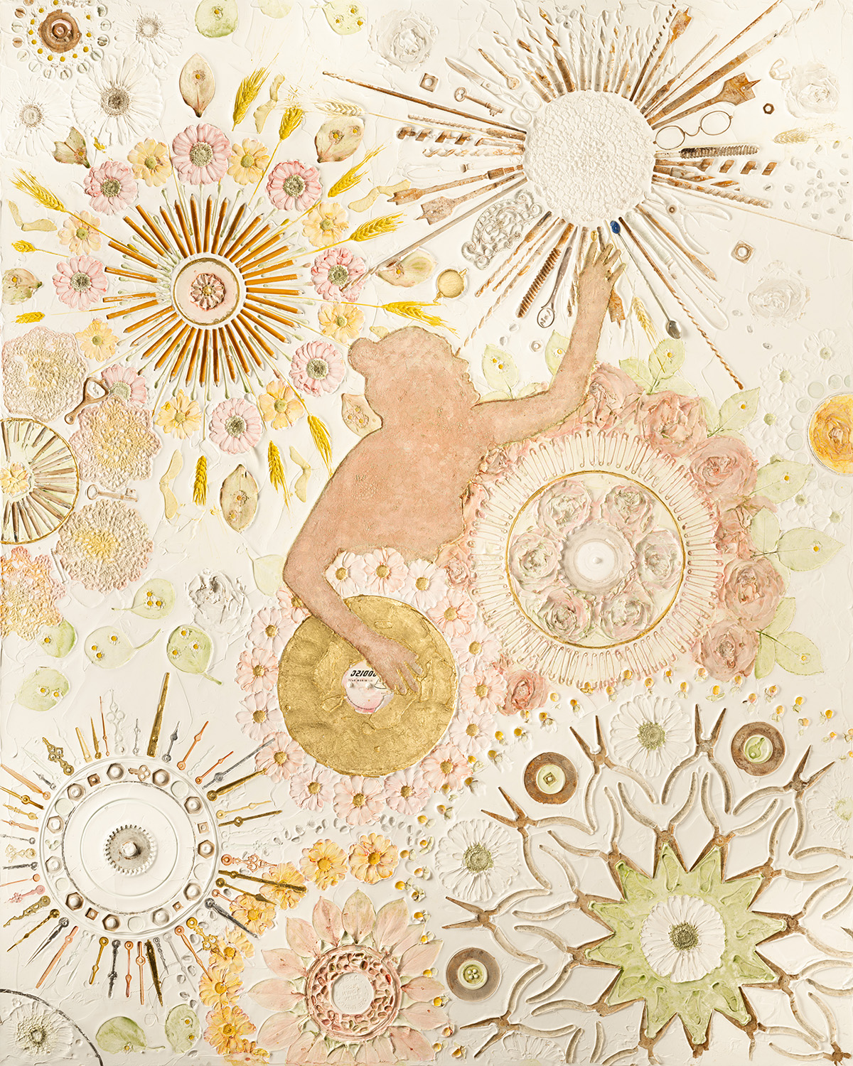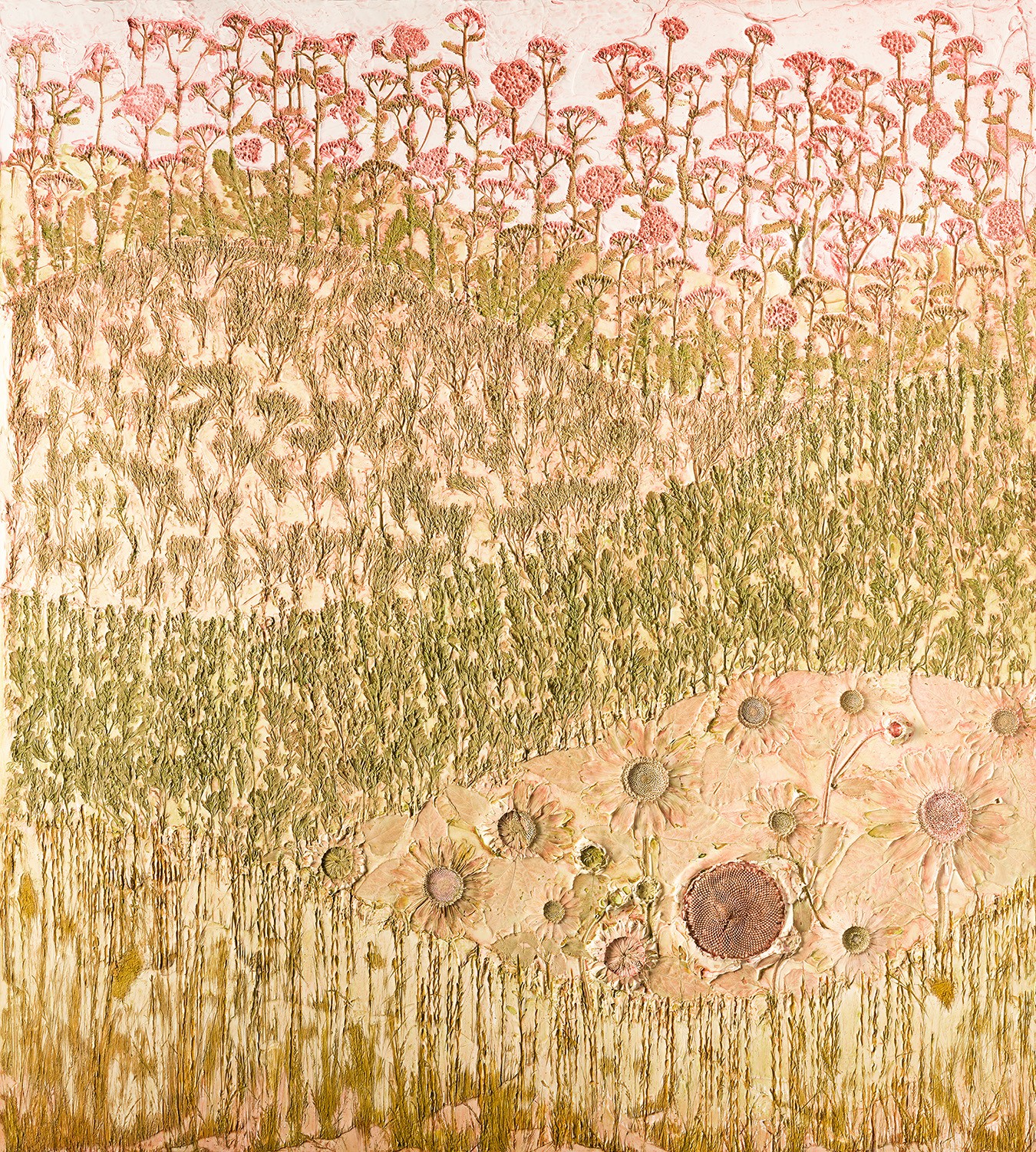 I am known for my unique technique of using plants and found objects to create extreme texture and delicate detail in my work. My process involves pressing, embedding, and layering organic materials and objects into the surface to capture both their physical presence and subtle color transfers. I specialize in larger-scale works that bridge painting and sculpture, often blurring the line between two- and three-dimensional forms.
