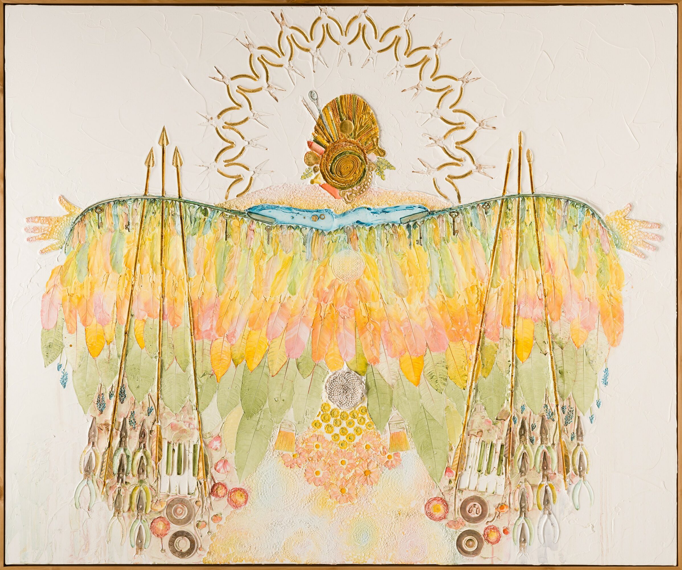 What sets me apart is both my technique and my perspective as an artist-mother. My children are often directly or indirectly incorporated into my work, influencing its themes and, at times, becoming part of the creative process. Additionally, the needle-nosed plier has become my signature found object; if you see one integrated into a painting, it’s most likely mine.