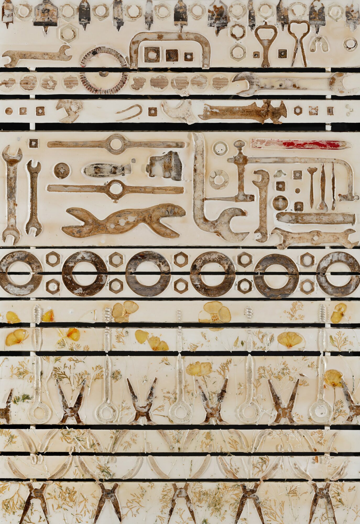 I later completed my MFA at George Mason University in Virginia. During pregnancy with my first child, I transitioned away from welding and large-scale sculpture for safety, which led me to experiment with ways to make my two-dimensional work more sculptural. I began incorporating tools, found objects, and eventually living plants, which now play a central role in my process. My technique creates extreme texture and delicate impressions, often allowing the natural colors transferred by the materials to guide the final composition.