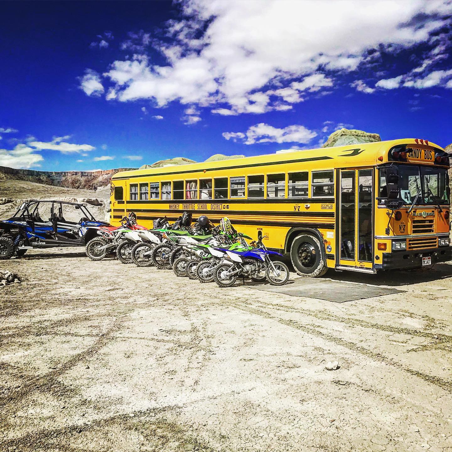 Whiskey Throttle School District’s journey began in 2013 with nothing but a dream, a school bus, and four best friends with a passion for adventure. We affectionately named that first bus “Sandy Bus” because, well, she got us stuck in the sand on our very first trip out! Little did we know, that was just the start of an incredible ride.