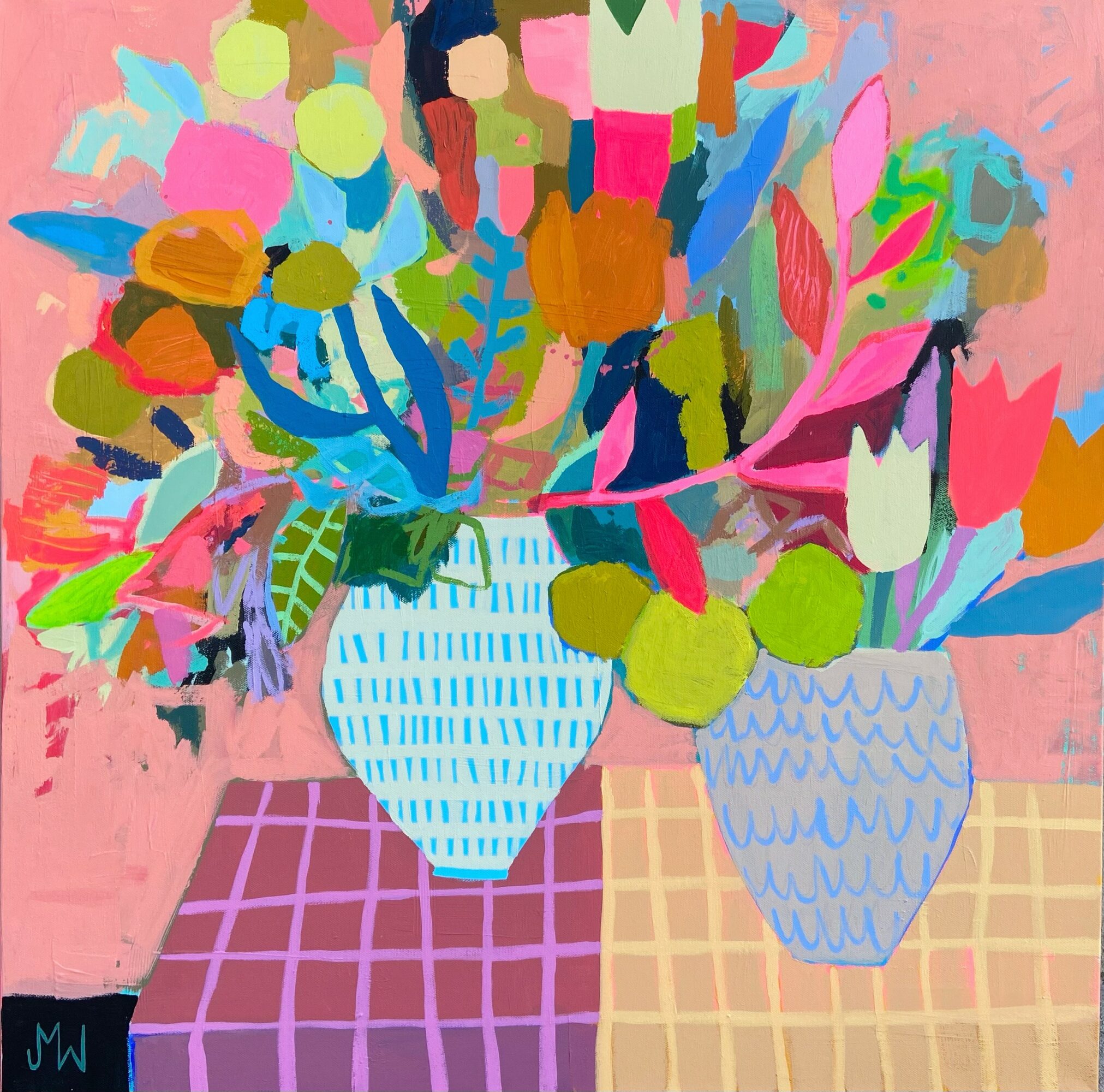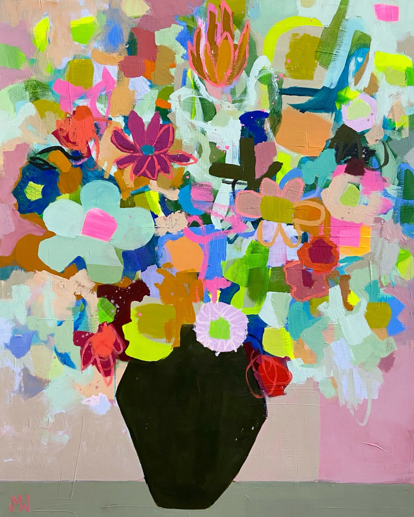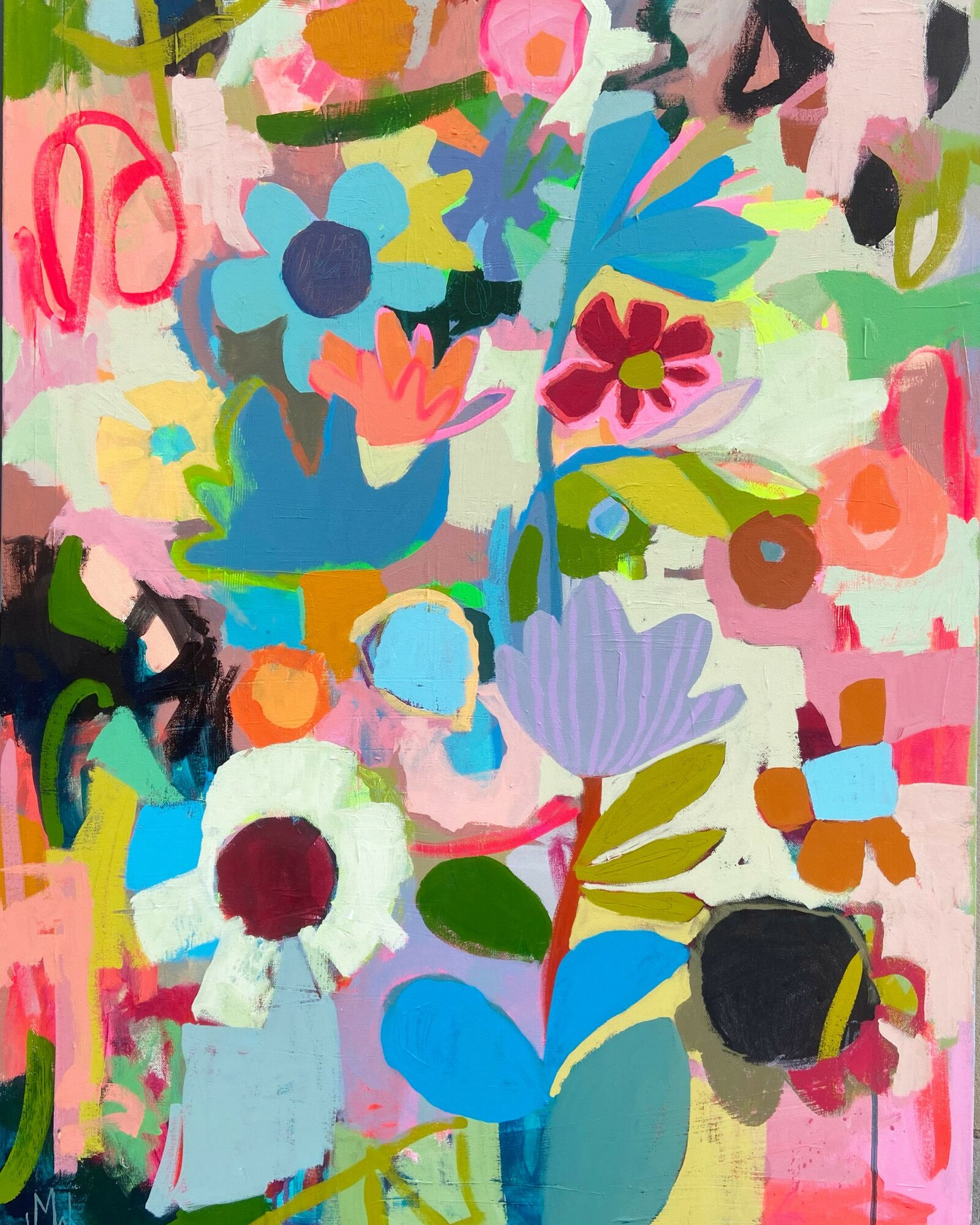 I create florals, landscapes, and abstracts using lots and lots of layers of paint. I’m kind of obsessed with what happens when I put two colors next to each other.